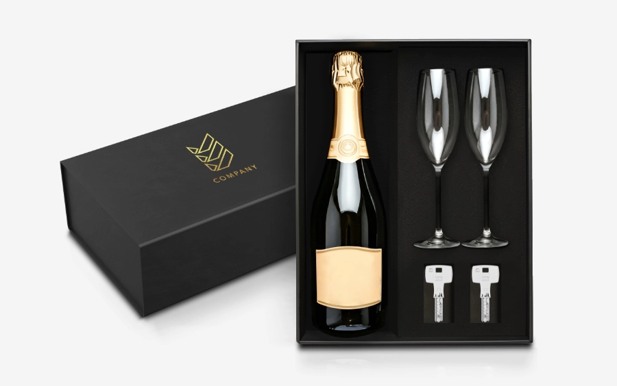 Hochwertige Magnetbox, mit Platz für eine Sektflasche und zwei Gläser.